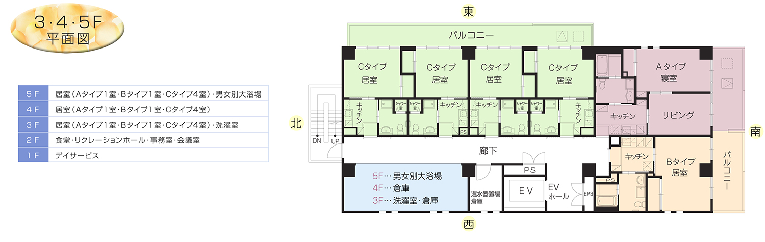 | 5F(9室) | 居室:Aタイプ(1室)・Bタイプ(1室)・Cタイプ(4室)・個別浴場/自立部屋 |